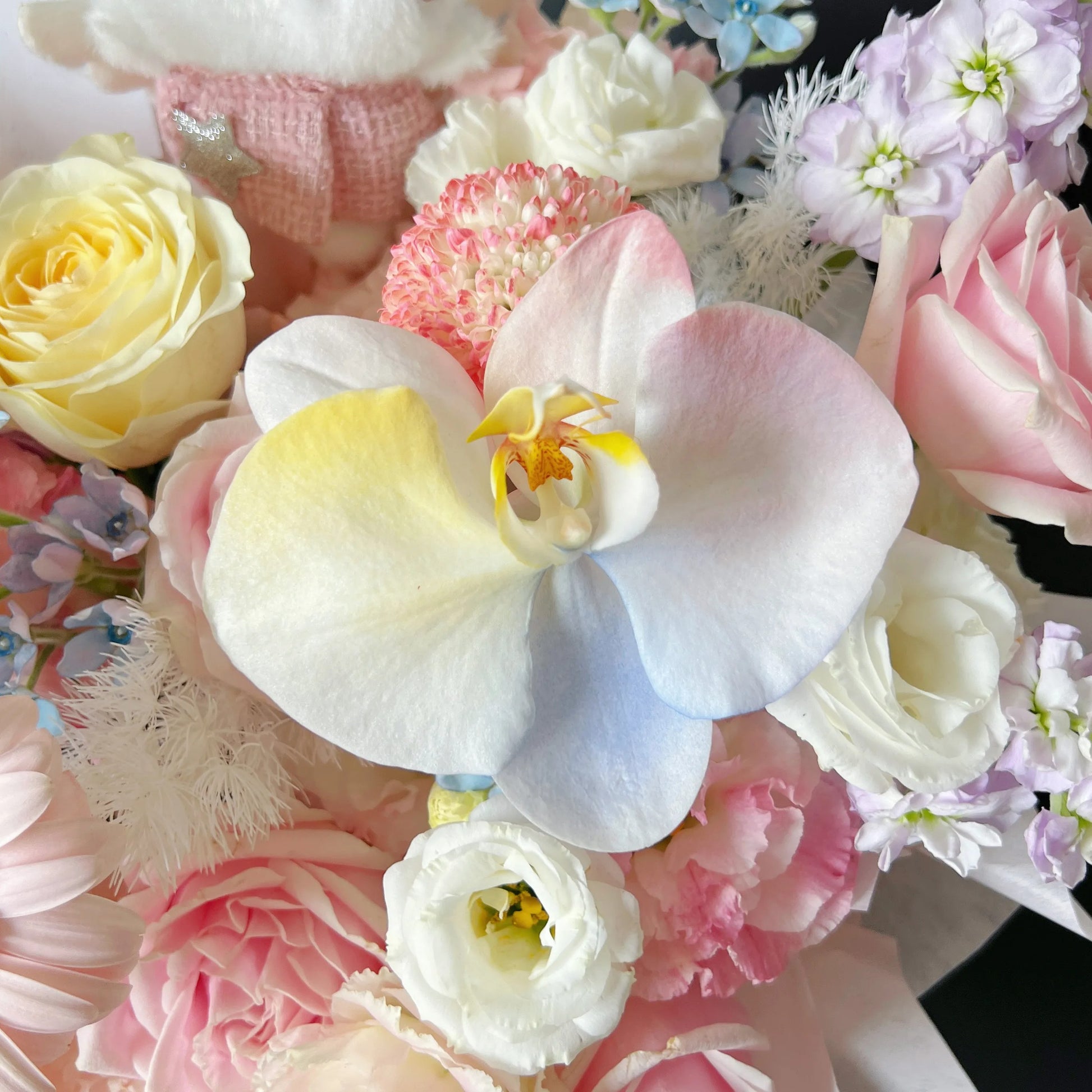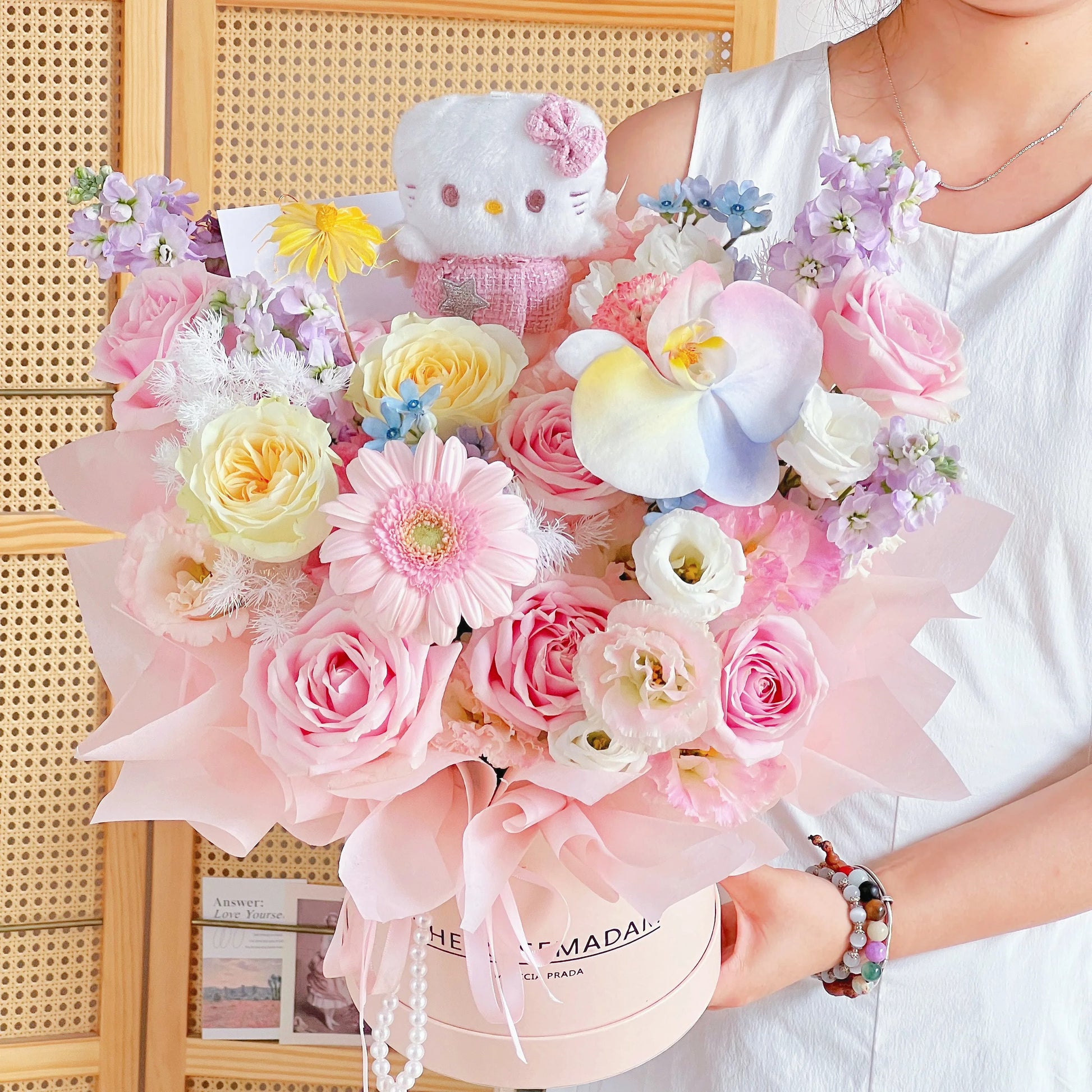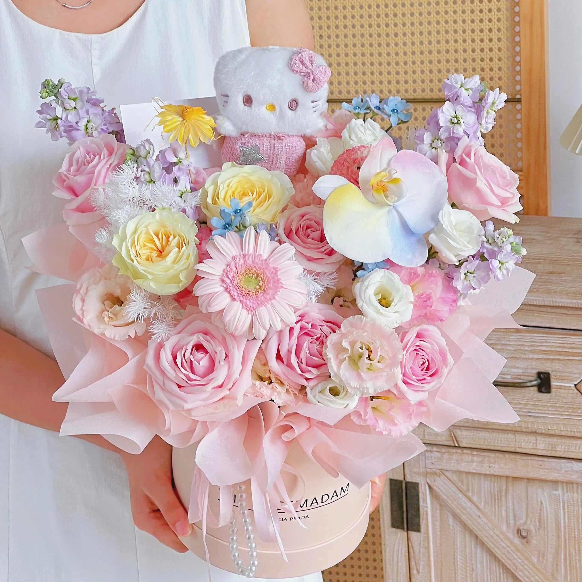 【Hello Kitty】粉雪山奶油杯蝴蝶蘭混搭鮮花桶