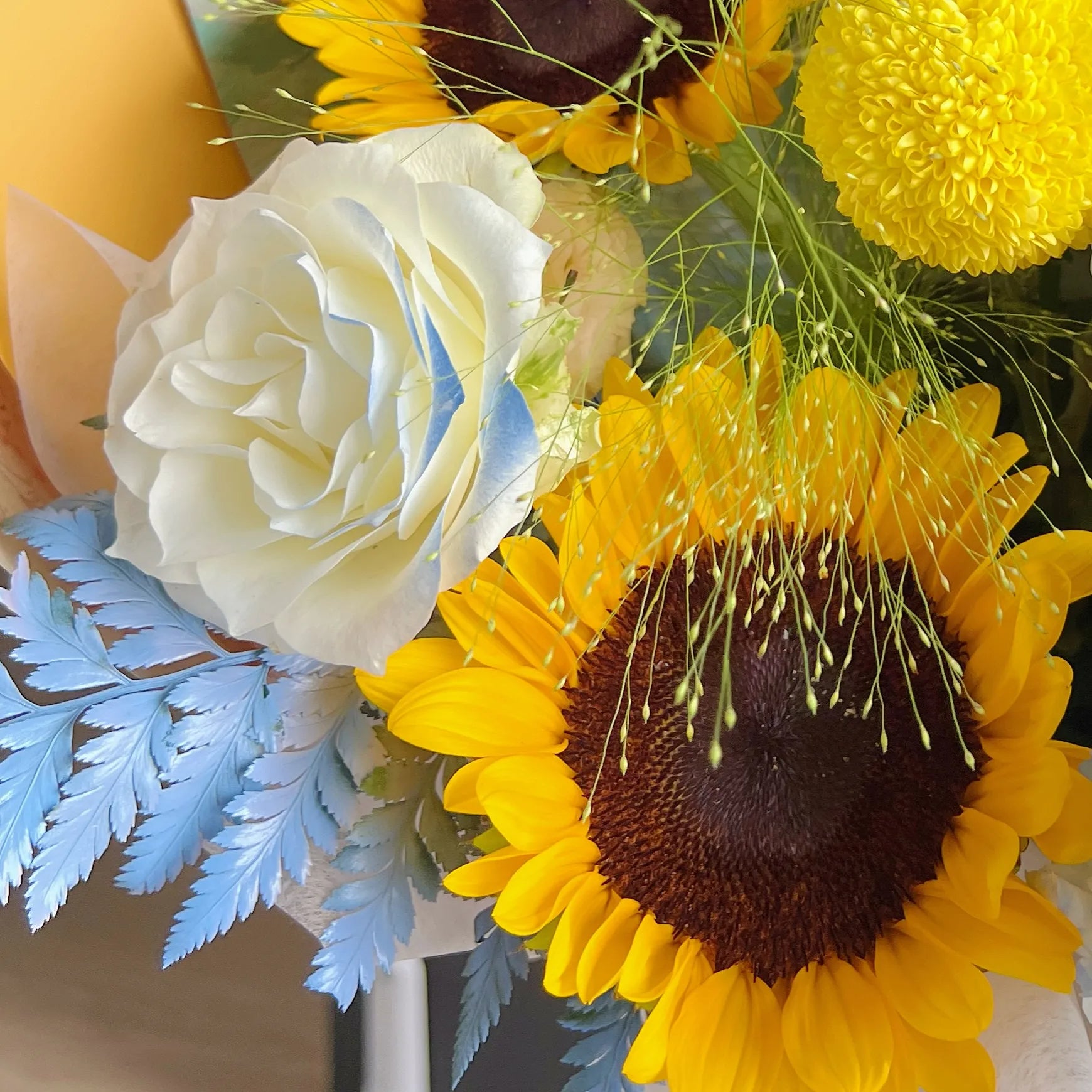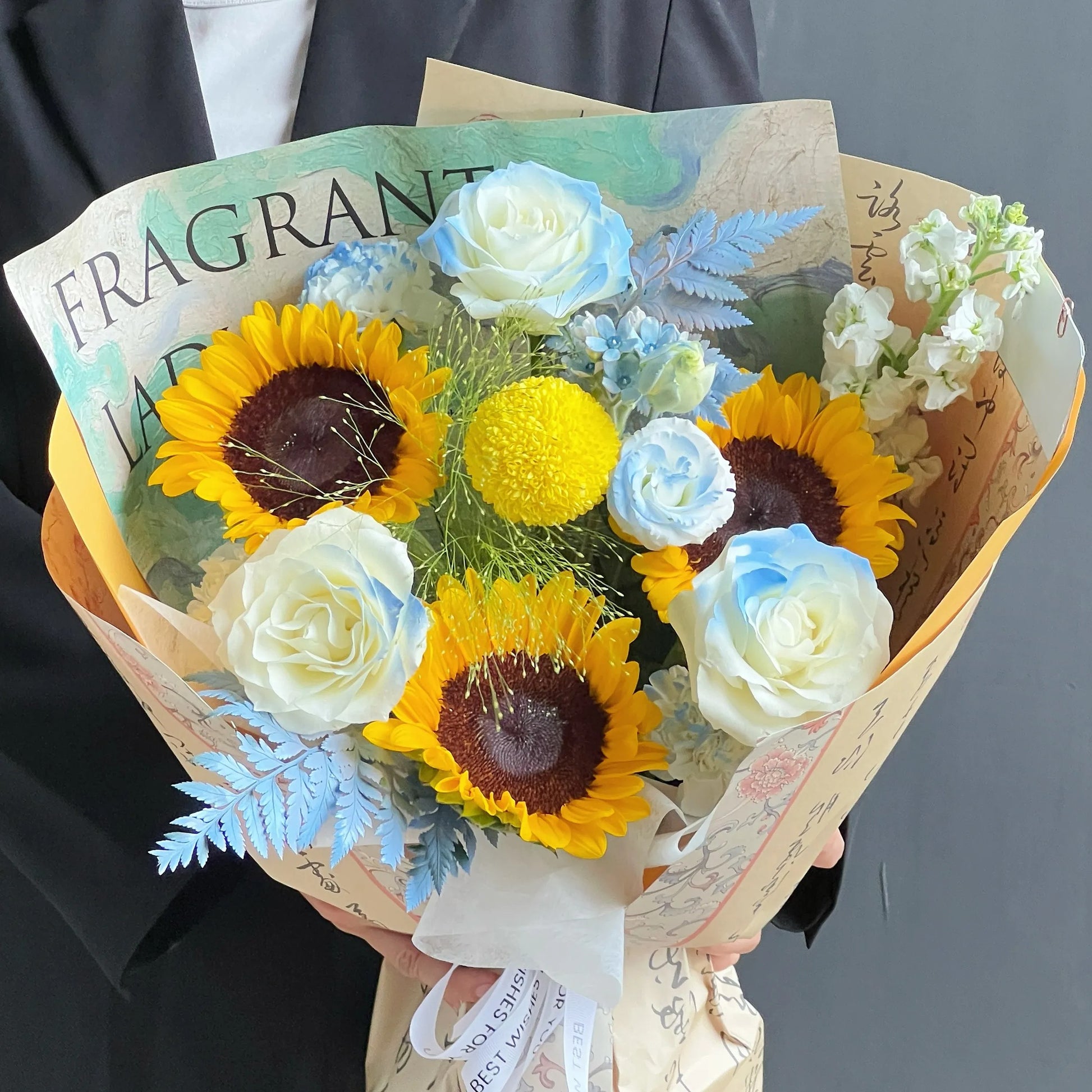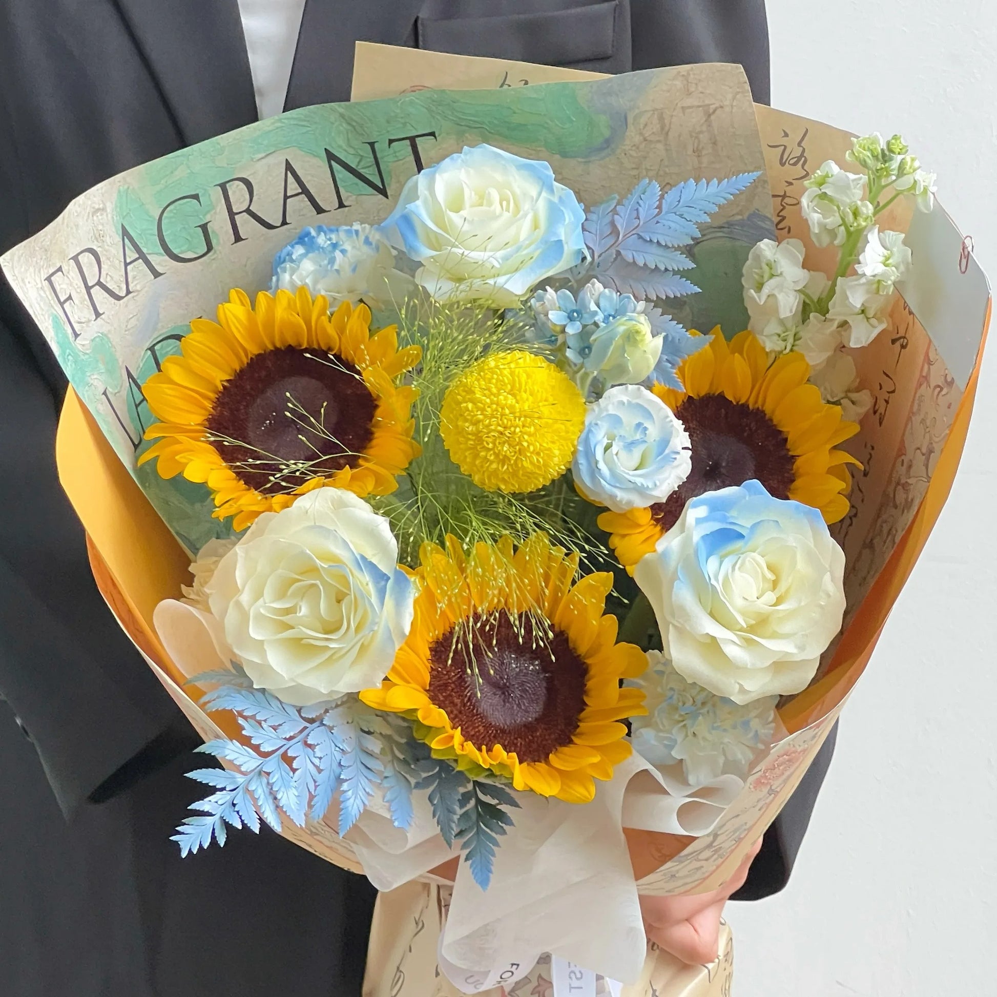 【向陽花開】向日葵碎冰藍乒乓菊混搭鮮花束